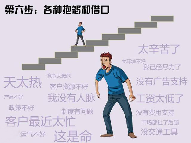 想知道这些销售员是如何一步步走向堕落的吗?请看他们的堕落全图,以此警醒自己,看看自己身上有没有这些缺点,如果你出现以下图中3个以上的症状,表示你也需要“自救”了。